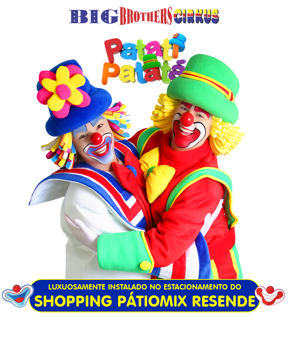 A dupla de palhaços mais amada do Brasil, Patati Patatá, estará em Resende para apresentações no Big Brothers Cirkus, luxuosamente instalado no estacionamento Shopping PátioMix Resende. Únicas apresentações: sexta (10/10) às 20h; sábado (11/10) e domingo (12/10) às 16h, 18h e 20h. No palco, os palhaços são acompanhados por dançarinos em um cenário colorido que propõe aos espectadores uma viagem ao lúdico. Além de curtir o show e cantar com seus melhores amigos, os pequenos poderão curtir momentos divertidos no circo, com direito a atrações circenses, personagens e muita animação! O show oficial da dupla conta com os ingredientes característicos de Patati Patatá: alegria, humor ingênuo e carinho com as crianças. “Um espetáculo para toda a família, com diversão garantida”, diz o diretor artístico, Rinaldi Faria.